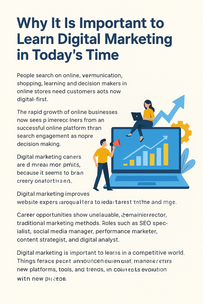 Another important reason is cost efficiency and measurable results. Traditional marketing methods like newspapers, TV, and hoardings are expensive and difficult to track. Digital Marketing, on the other hand, allows businesses to start with a small budget and measure performance in real time. Tools like Google Analytics and social media insights help marketers understand what is working and what needs improvement. Learning Digital Marketing teaches you how to analyze data, optimize campaigns, and improve return on investment (ROI), which is a highly valued skill in today’s job market.